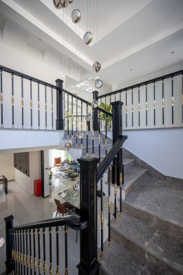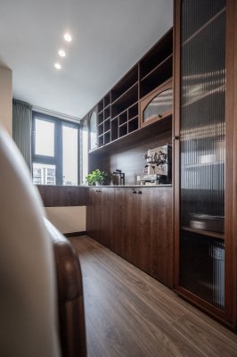 新中式風(fēng)格,也被稱為年輕人的中式,以中國傳統(tǒng)文化為背景,保留青花瓷等工藝細(xì)節(jié)的元素,又突破原來的厚重與繁瑣,用一種新的更加簡潔的設(shè)計語言塑造具有韻味的裝修風(fēng)格。 本案例業(yè)主其實頗為年輕,但是對中國傳統(tǒng)文化略有涉獵,希望新房裝修既具有中式古典韻味又不顯壓抑,考慮到家里兩位老人的起居需求,也希望動線更加合理,廚房的操作更加簡單。 新中式講究線條和對稱之美,設(shè)計之時,田甜老師對這套邊戶的聯(lián)排別墅的概念把握的清晰明了,從中國傳統(tǒng)圖案或者傳統(tǒng)書畫作品中提取線條,運用于整套作品的設(shè)計系列,突出古典